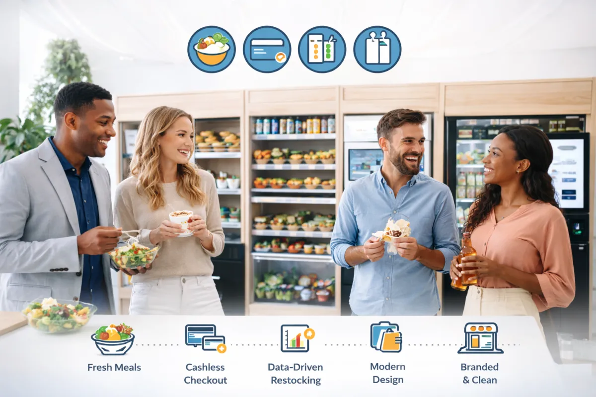 Smart vending technology and data-driven servicing ensure uptime, freshness, and reliability.