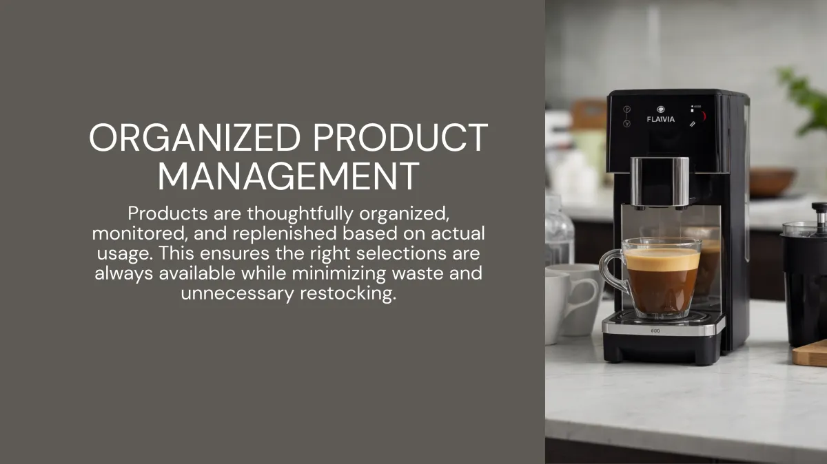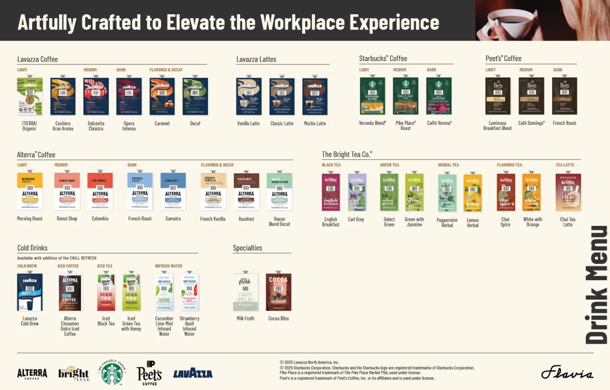 Our Single-Serve Coffee Program is designed for workplaces that want reliable coffee without complexity. Built around the FLAVIA ecosystem, it delivers consistent flavor, easy operation, and a clean, organized breakroom experience.